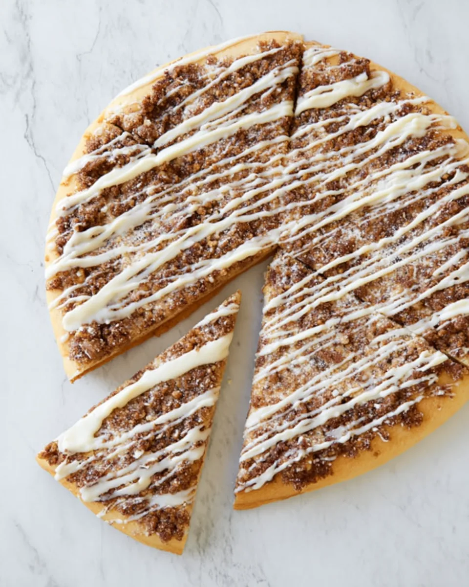 - Drizzle & Serve Your Masterpiece: The moment it comes out of the oven, don’t delay! Immediately drizzle that sweet, smooth glaze all over the warm, bubbly streusel. The warmth of the pizza will melt the glaze just a bit, creating a luscious finish. Slice it up into generous wedges or fun squares, and serve this easy, glorious **Cinnamon Streusel Dessert Pizza** while it’s still wonderfully warm! Enjoy every sweet, crumbly bite!