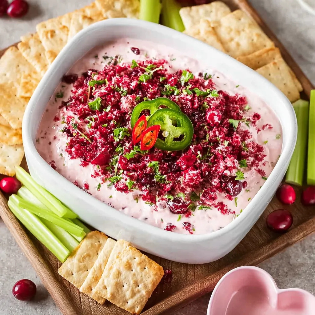 - Spoon the creamy dip into your favorite serving dish. Top with the remaining chopped cranberry mixture and garnish with a little extra green onion, a slice of jalapeƱo, or fresh parsley if you like. Serve this delightful dip with crackers, pita chips, or fresh veggies like celery and broccoli florets.