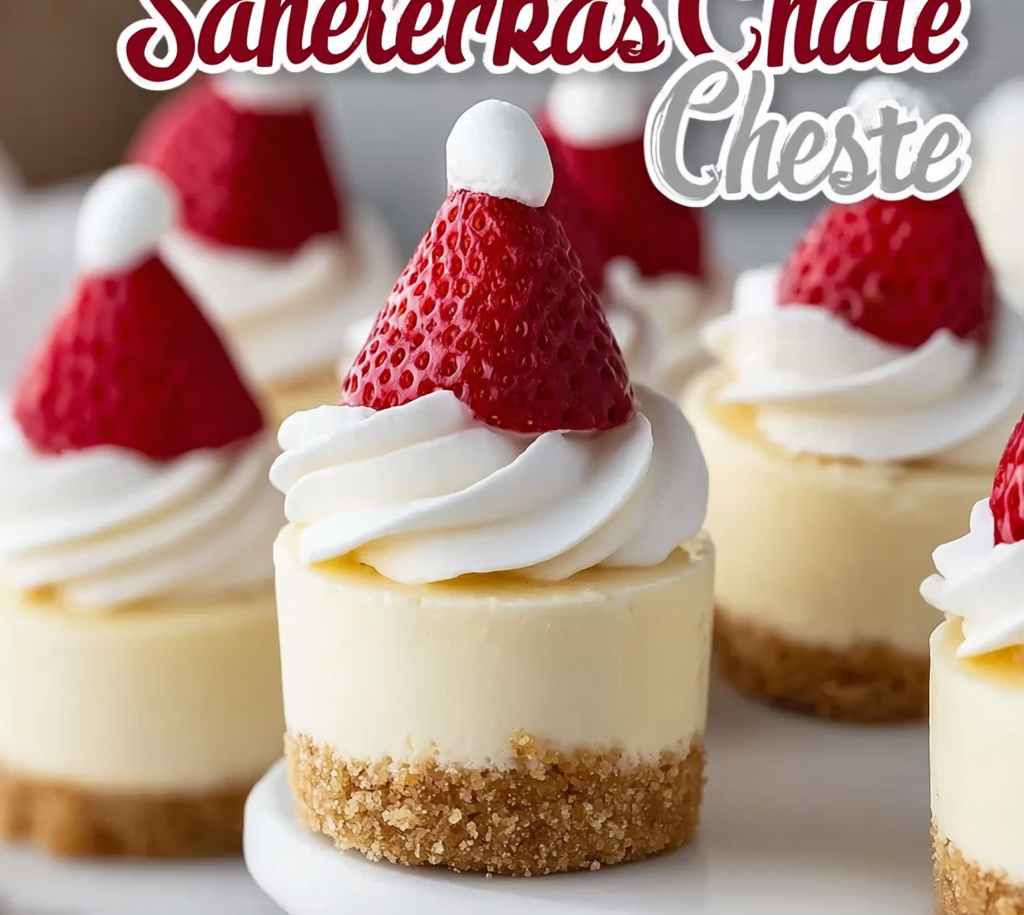 - Assemble Santa Hats: Once your mini cheesecakes are perfectly chilled, pipe a lovely swirl of whipped cream on top of each one. Carefully place a hulled strawberry, pointed side up, onto the whipped cream. For that perfect Santa hat look, add a small dot of whipped cream right on the very tip of each strawberry!
