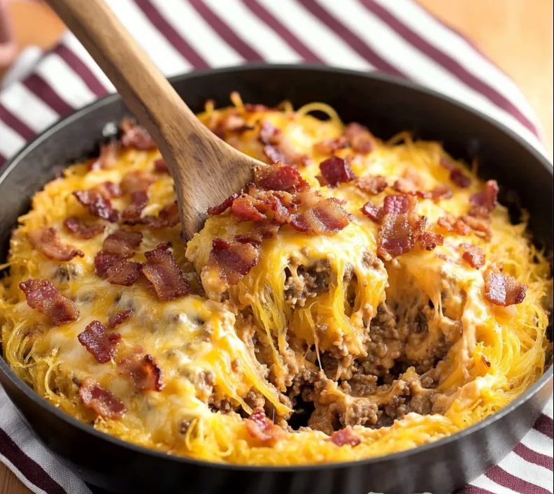 From the tender spaghetti squash strands to the crisp bacon and melted cheese topping, this dish is a texture lover’s dream.