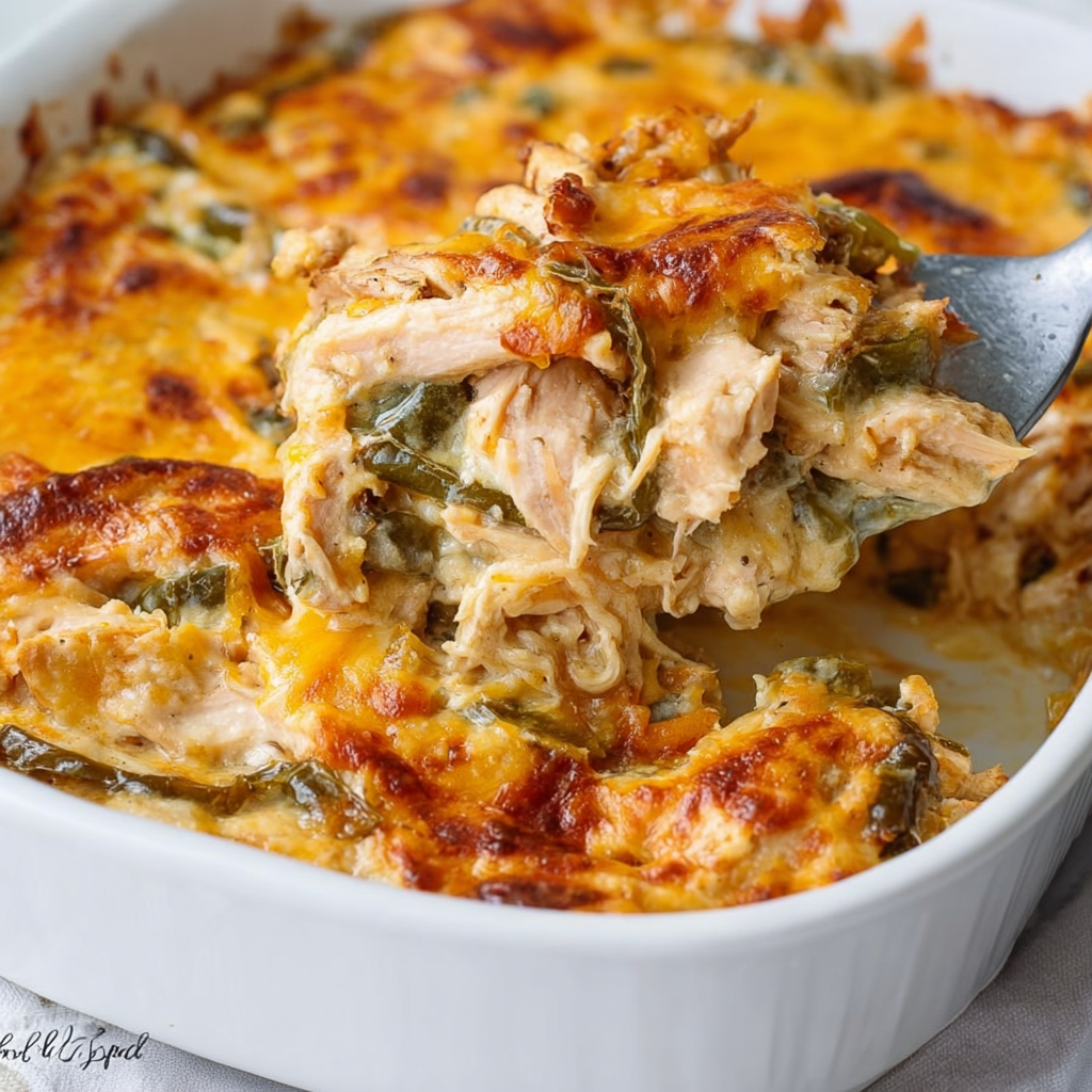 Spread the chicken mixture evenly in the casserole dish. Top with the roasted poblano peppers, distributing them evenly across the surface. Bake for another 20 minutes, allowing the flavors to meld and the cheese to melt beautifully.