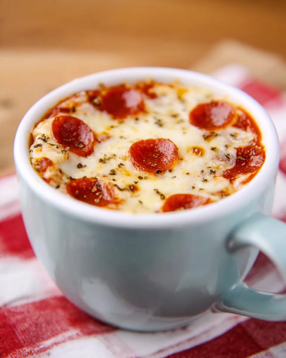Any microwave-safe mug will work! A wider mug might help the pizza cook more evenly, but a standard coffee mug is perfectly fine. - How do I know when the mug pizza is done cooking?